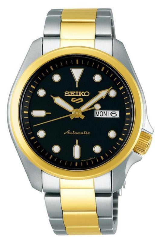 Seiko 5 Sports 100M Automatic Men's Watch Black Dial 2 Tone Gold Plated SRPE60K1