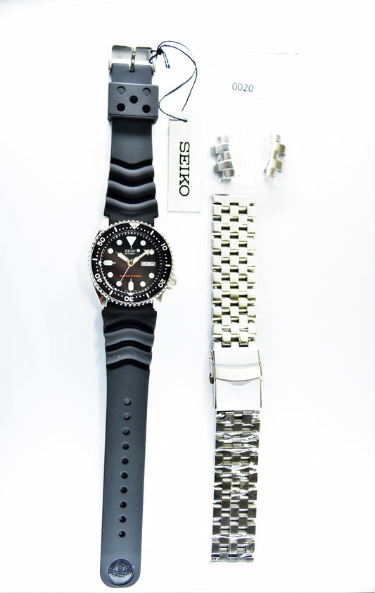 Seiko Black SKX 200M Diver's Junior Size Rubber Strap+All Stainless Steel Jubilee Bracelet Watch SKX013K1 SET