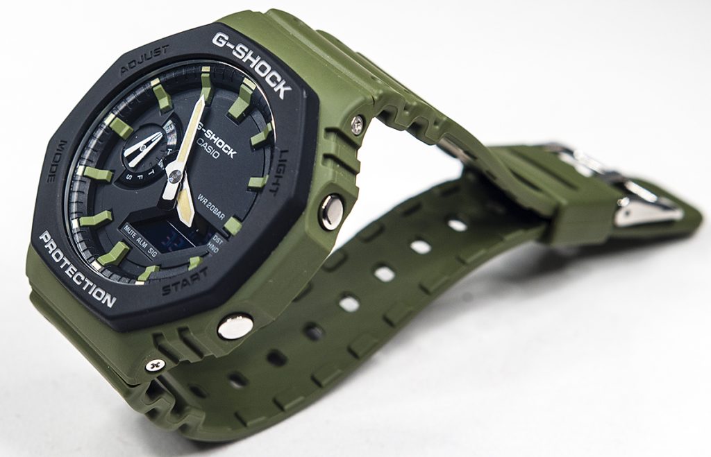 This new model combine practical and utilitarian colors of the bezels, faces, and bands that go well with street fashions, to create distinctive looks that fit right in with a wide range of fashions and activities. The camouflage pattern printed on the bezel of the GA-2100SU model