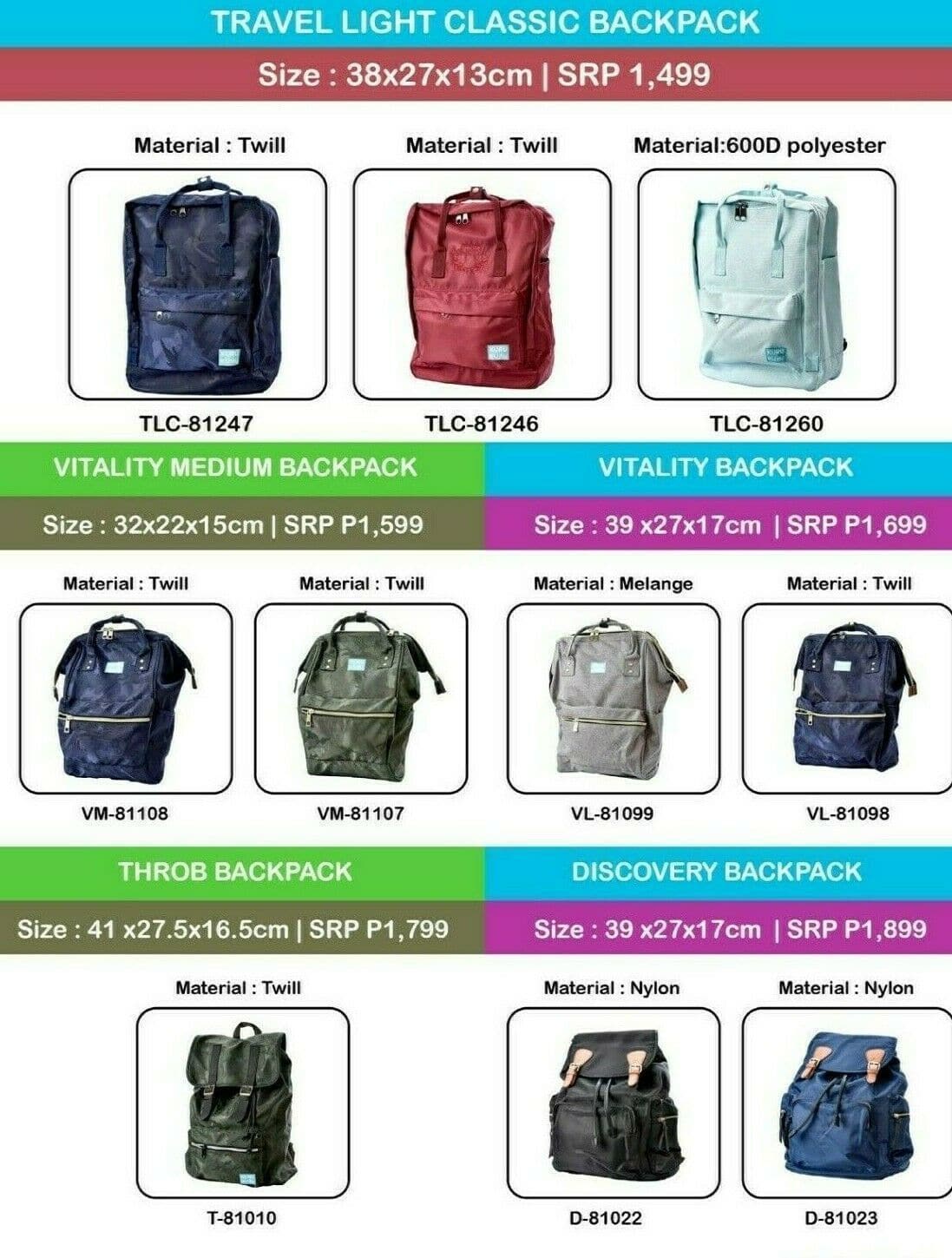 Our bags are mostly backpacks made out of twill fabric material which drapes well and is highly wrinkle, tear, and water resistant.
