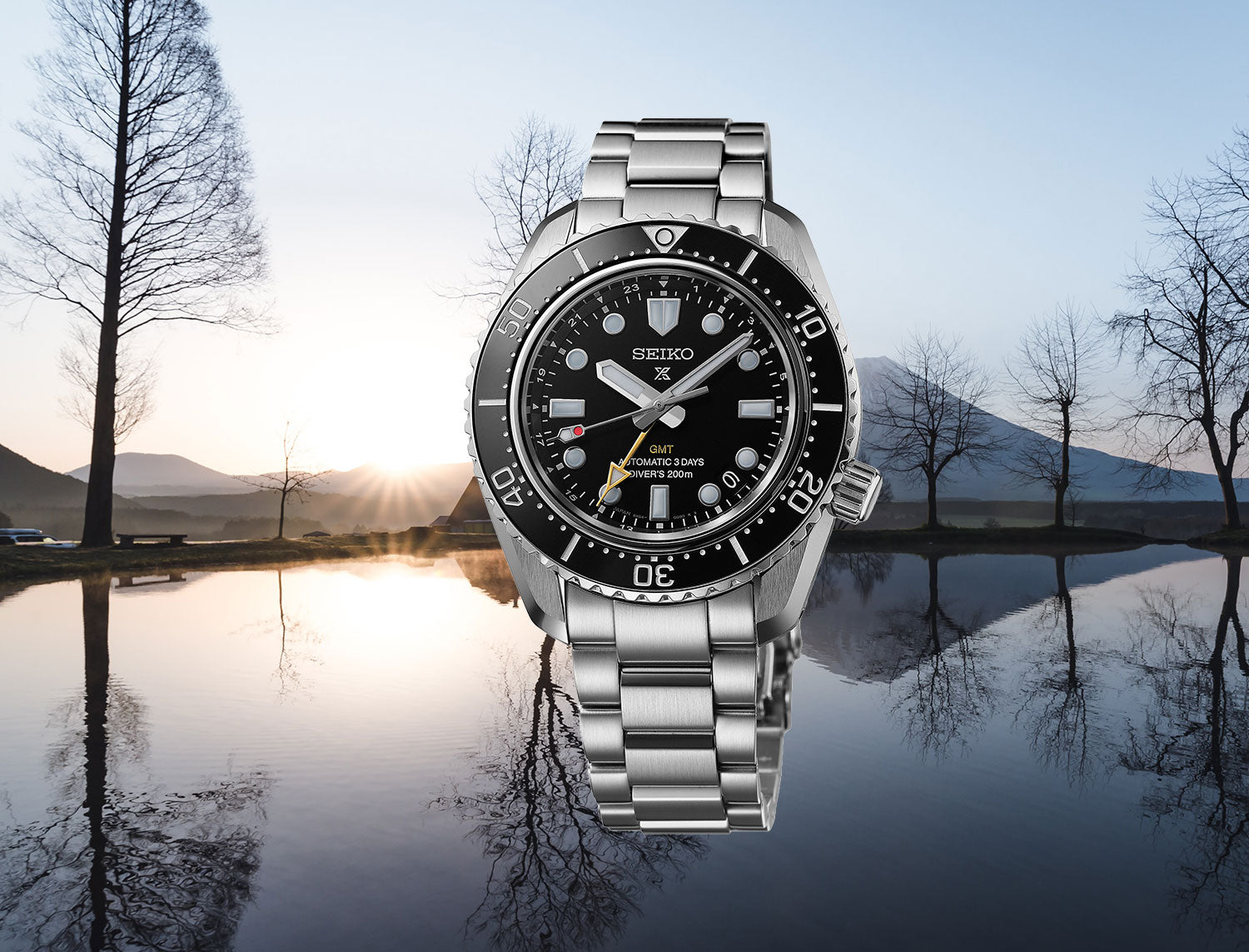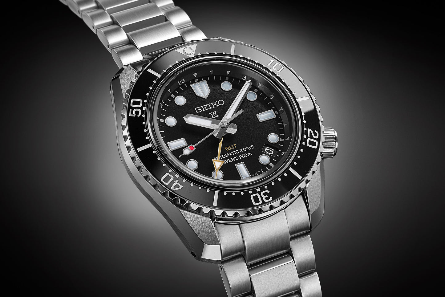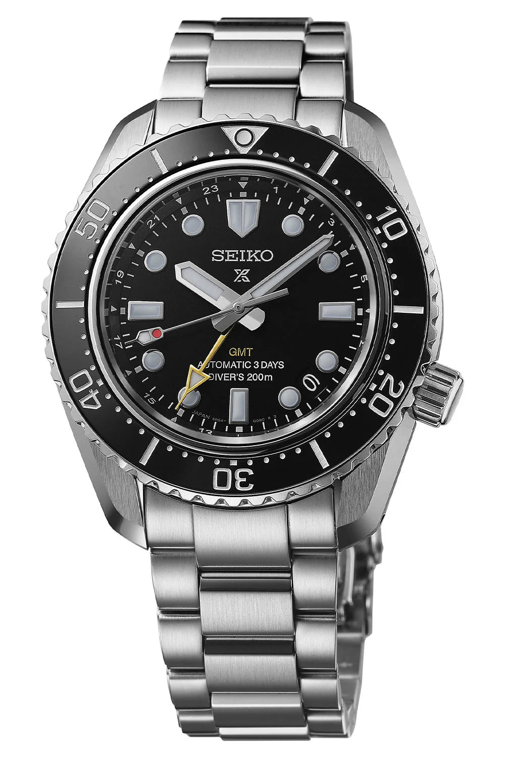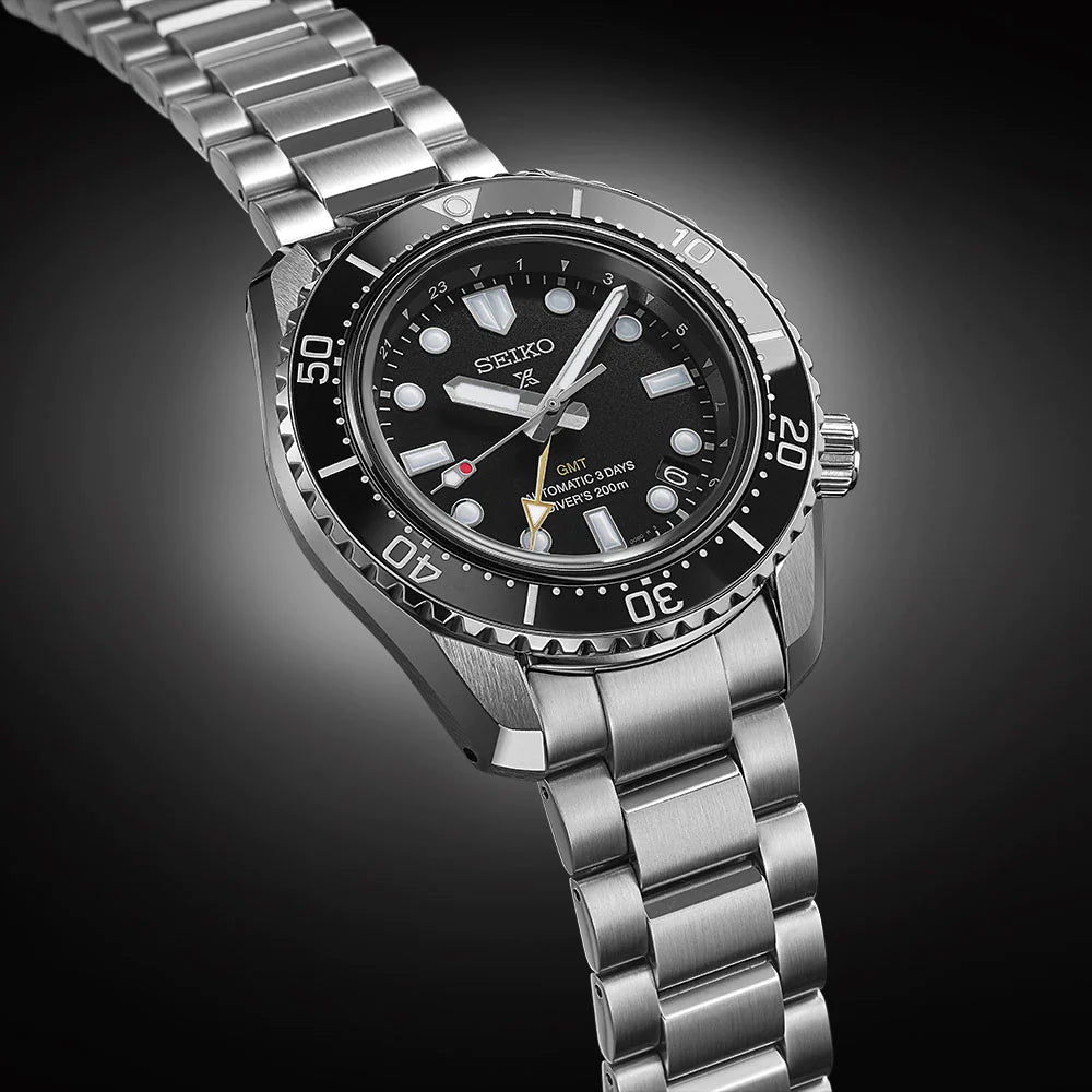 This Black GMT is a re-interpretation of the 1968 first hi-beat one-piece Diver’s watch created by Seiko. The success of the 1968 model laid the foundation for Seiko Diver’s watch development which today is still as innovative and high quality as it was then. The watch is powered Seiko’s own Calibre 6R54 movement and is the first of Seiko’s diving watches with mechanical GMT functionality. The bracelet fits comfortably due to its low centre of gravity and short-pitch. With a 72 hr power reserve, high-quality scratch resistant Japanese ceramic diving bezel and water resistance up to 200m, the watch looks fantastic, both in the water as on land.