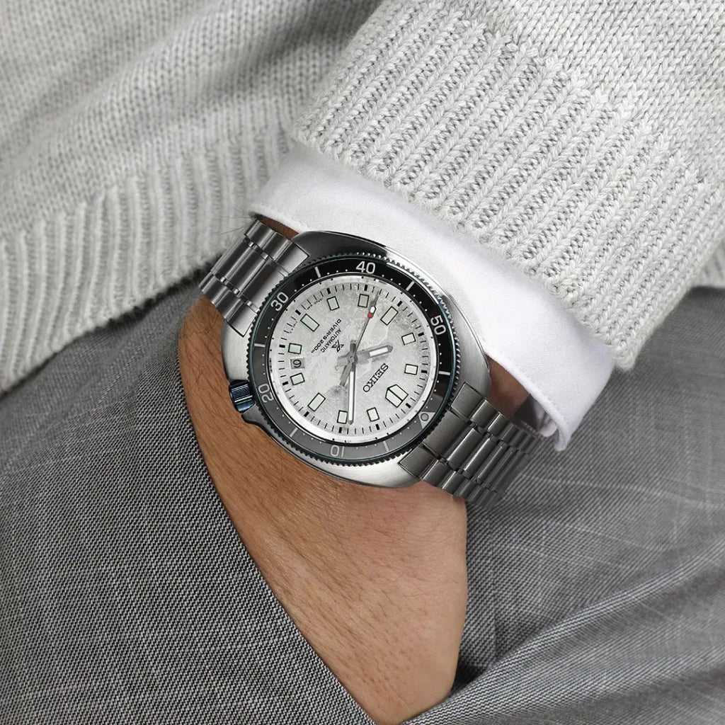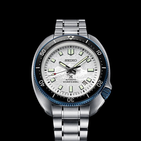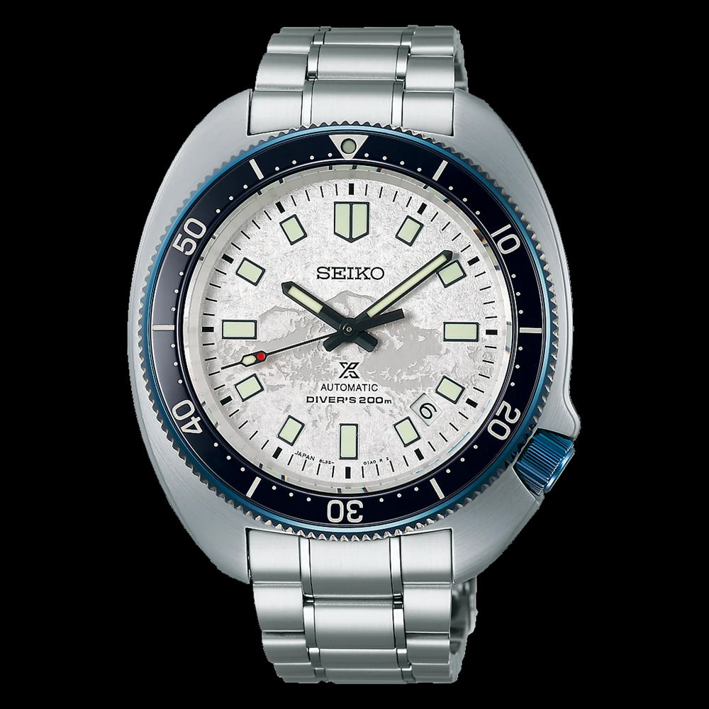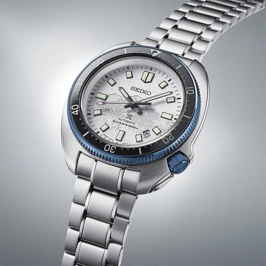 Choosing just one ‘flagship’ dive watch from Seiko’s vast history is impossible, but many will agree that one of their most historically important designs is that of the Seiko 6105, a 150m diver’s watch from 1970. While many Seiko collectors have dubbed reinterpretations of this watch as the Seiko “Captain Willard” for appearing in the movie Apocalypse Now, the Japanese watchmaker instead names the design after its association with Naomi Uemura. Uemura was a Japanese mountaineer who famously wore the Seiko 6105 from 1974 to 1976 during his solo dog sled from Greenland to Alaska. He is also world-renowned as the first person in the world to reach the summits of the five mountains Mont Blanc, Kilimanjaro, Aconcagua, Everest, and Denali. In honour of his ascent up the first mountain, Mont Blanc, Seiko have launched the Seiko Prospex 1970 Diver’s ‘Naomi Uemura’ Limited Edition SLA069J1 watch which neatly replicates the stylings of the Seiko 6105 and pairs it with a new blue and white colourway and mountain-etched dial.
