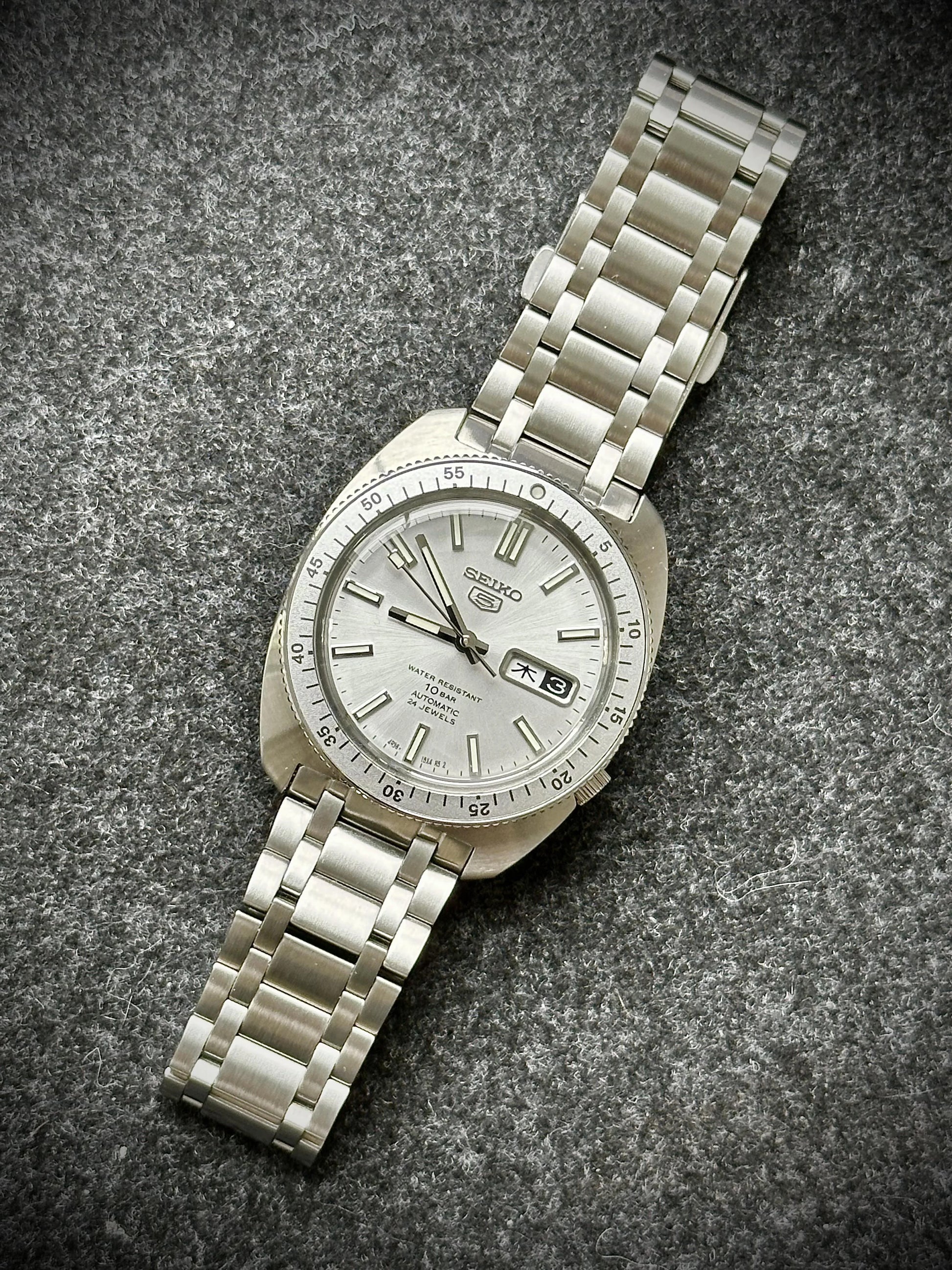 This 1968 Heritage Limited Edition is a great, versatile sports watch. It's a true all-rounder with 100m water resistance, rotating bezel and a comfortable 38.5mm case (excluding crown) and a modest 44.7mm lug to lug distance. The great vintage-style black dial with the day and date at the 3 o'clock position is protected by Hardlex mineral glass and under the hood is the mechanical (automatic) Seiko in-house Cal. 4R36 movement. This model pays tribute to the rich history of Seiko 5, spanning 56 years in 2024 and embraces all of the design queues of the first, original model. Thanks to the case diameter of 44.7 mm, it is classified as a medium-sized watch, suitable for most men's wrists.