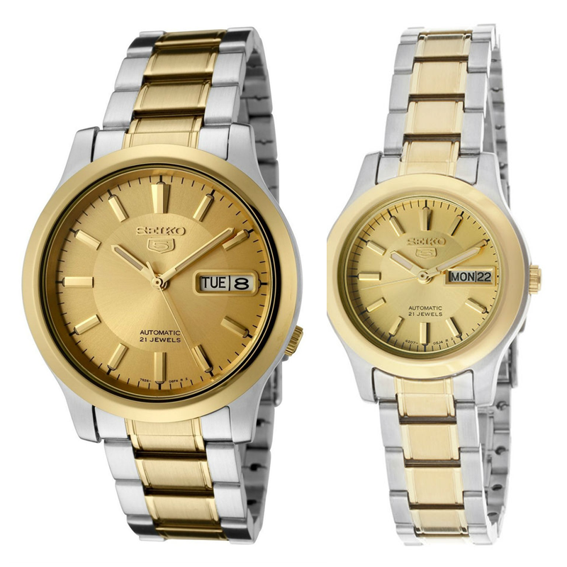 Seiko 5 Classic Gold Dial Couple's 2 tone Gold Plated Stainless Steel Watch Set SNK792K1+SYMD92K1