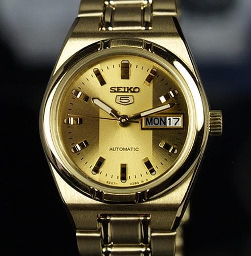 Seiko 5 Classic Ladies Size Gold Dial Gold Plated Stainless Steel Strap Watch SYM600K1