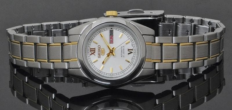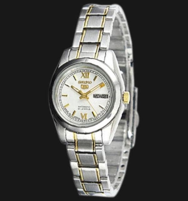 Seiko 5 Classic Ladies Size Silver Dial 2 Tone Gold Plated Stainless Steel Strap Watch SYMK29K1