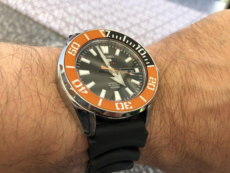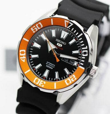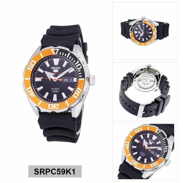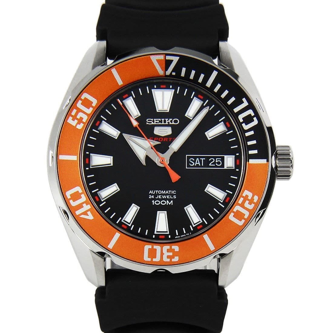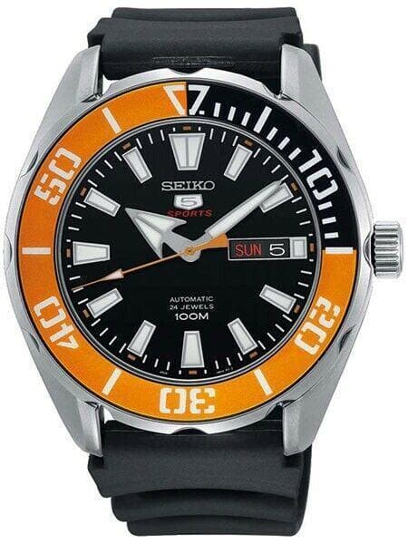Seiko 5 Sports 100M Black Dial Orange Bezel Men's Rubber Strap Watch SRPC59K1