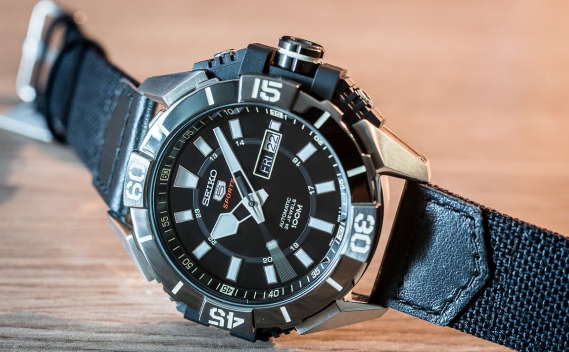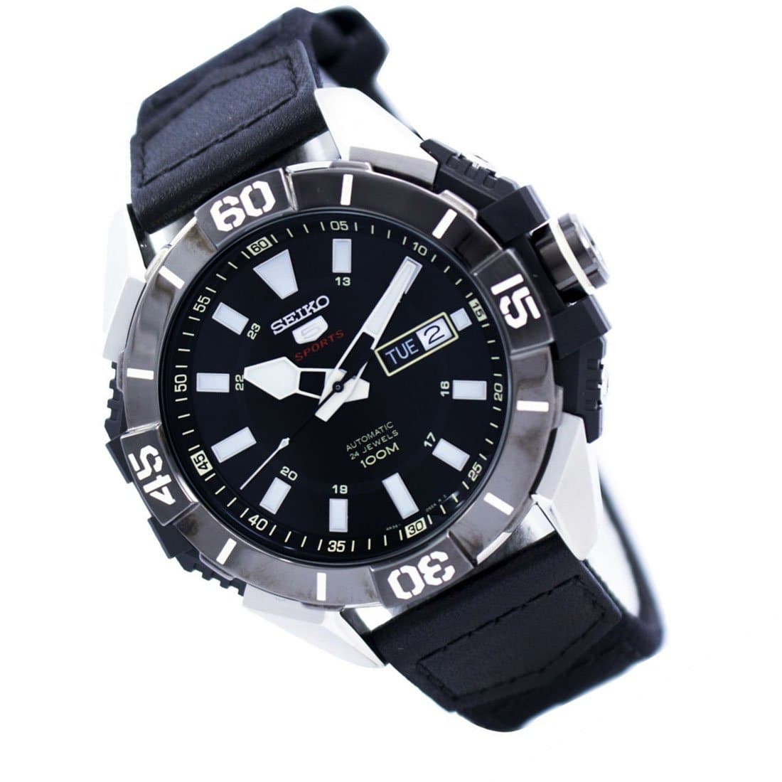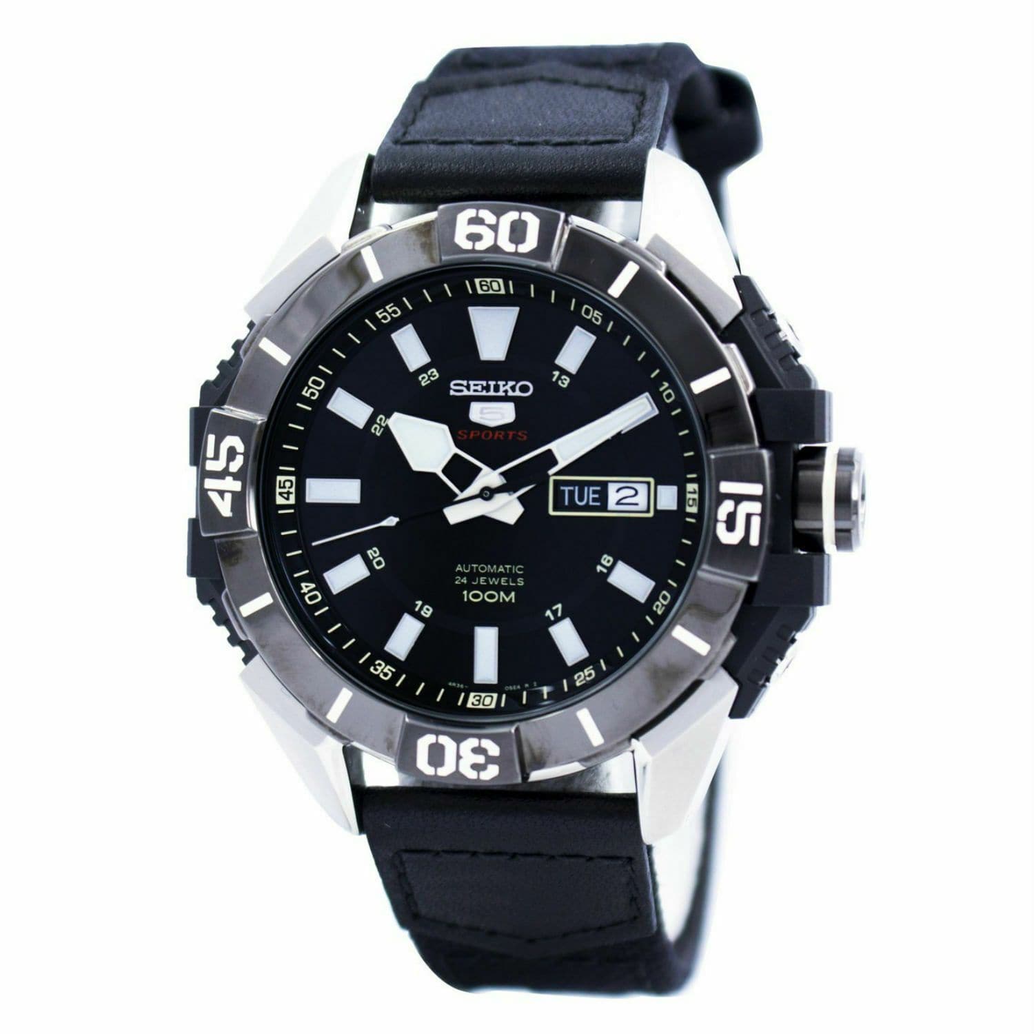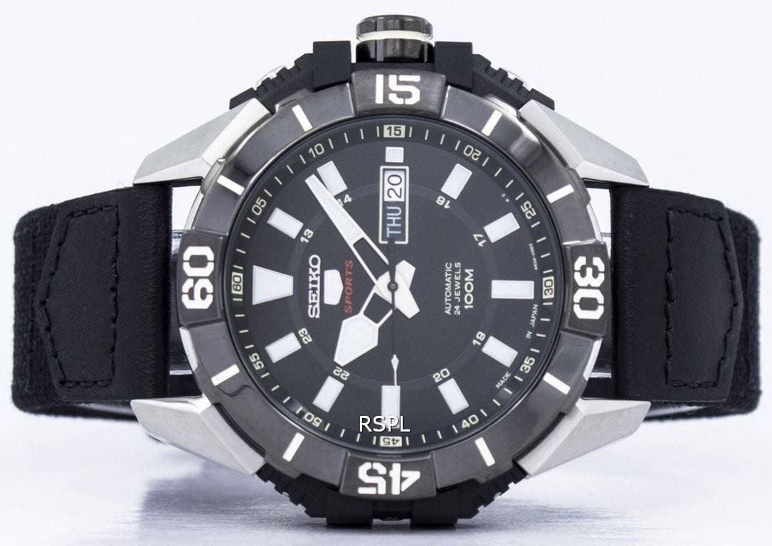 Seiko 5 Sports 100M Men's Black Dial Leather Nylon Strap Watch SRP799K1