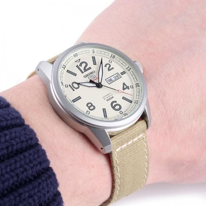 Seiko 5 Sports Military 100M Automatic Men's Watch Creme Tan Canvas Nylon Strap SRP635K1