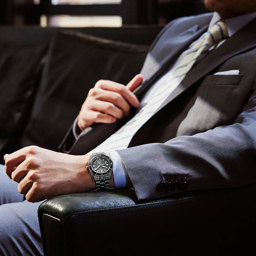 This contemporary iteration incorporates elements from the 1965 original diver, such as its silhouette and distinctive hour markers. The dial, adorned with a horizontal line pattern, exudes a marine-sports aesthetic, and the sapphire exhibition case back is a novel addition to Seiko Diver watches. Mirrored-finish lugs enhance light reflection, and the thick Lumibrite-coated hour markers ensure high legibility. Despite the inclusion of box sapphire glass and the exhibition case back, this is the slimmest among Seiko mechanical divers watches at just 12.3mm.