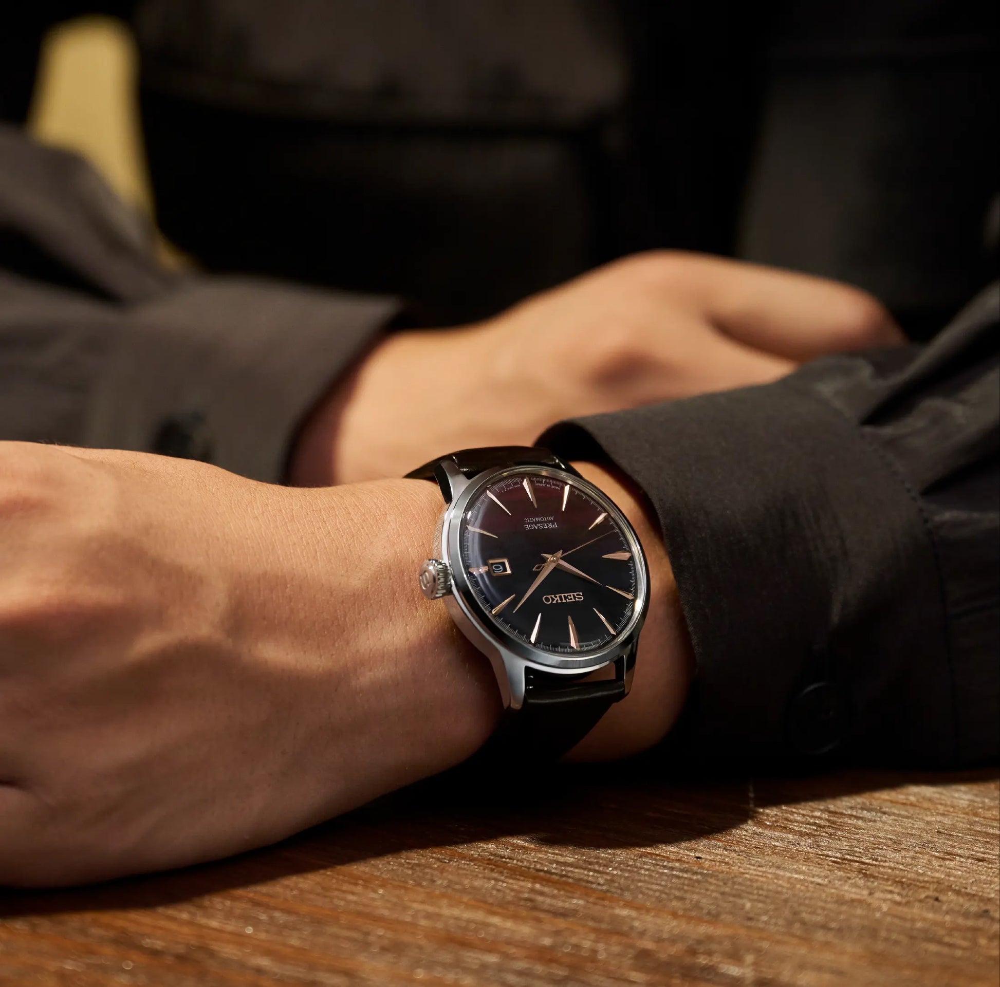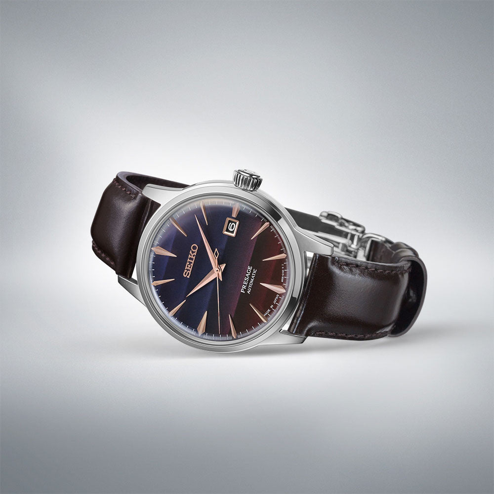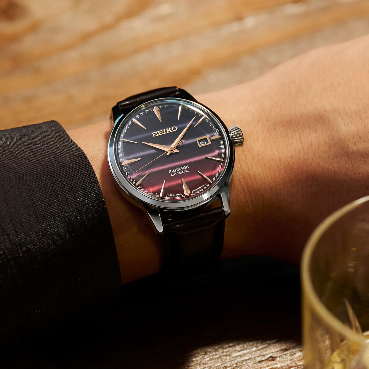 The Seiko Presage Cocktail Time collection designs are influenced by this Japanese tradition of finishing the working day off with a cocktail and a chat – with each timepiece named after drinks mixed by Hisashi Kishi, head bartender and owner of Star Bar in Tokyo’s Ginza area and a past winner of the International Bar Association World Championships.