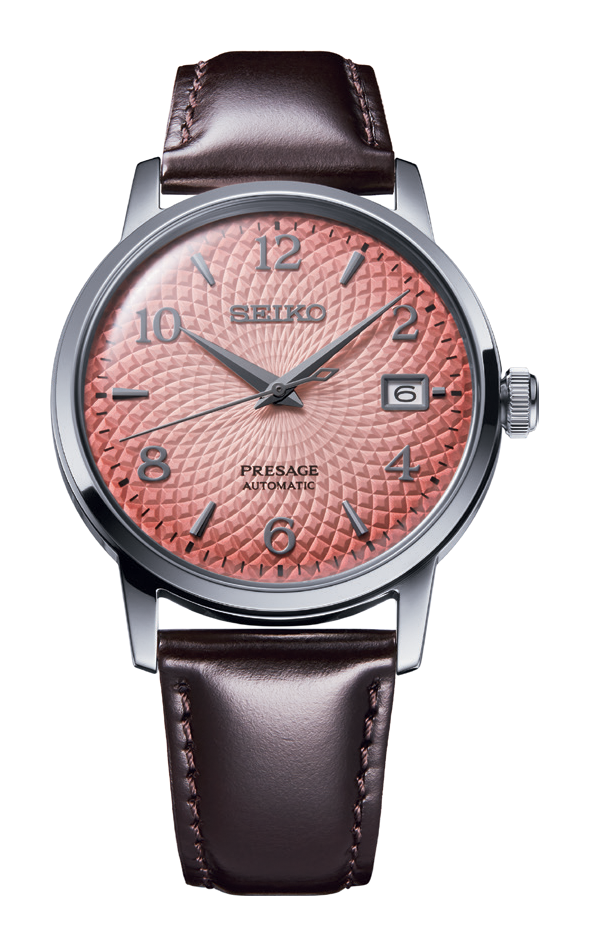 The pink dial color of this model is inspired by a cocktail, the Tequila Sunset.