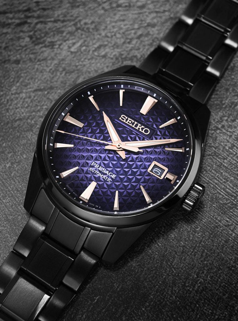 Now comes the main highlight, Seiko Presage Sharp Edged Series introduces a Limited Edition watch inspired by dawn. These watches are inspired by what the Japanese refer to as akebono — “when the dark of night gives way to the glimmers of dawn.” This is translated into the stark black case and bracelet, which are paired with a dégradé purple dial. The hands and indices are executed in a rose gold color, representing rays of sunlight. Black hard-coating is applied to the stainless steel case and the bracelet, which echoes the dark sky before sunrise. The gold hands and indexes represent the morning twilight of early dawn, and the gradation on the dial foreshadows a new day. This is where Seiko's link of their prowness in combining watchmaking with its tradition and culture. The dial incorporates a Japanese Asanoha or hemp leaf pattern, familiar in Japanese culture for its use in design since the Heian period over a thousand years ago. The Asanoha leaf was traditionally used as material for fabrics and the pattern holds a special importance in Japanese culture as it symbolizes rapid, strong growth and was thought to bring good health, especially to the young. The rich texture and intricacy of the dial’s sharply edged geometric pattern create a subtle color gradation as they play with the light at different angles.