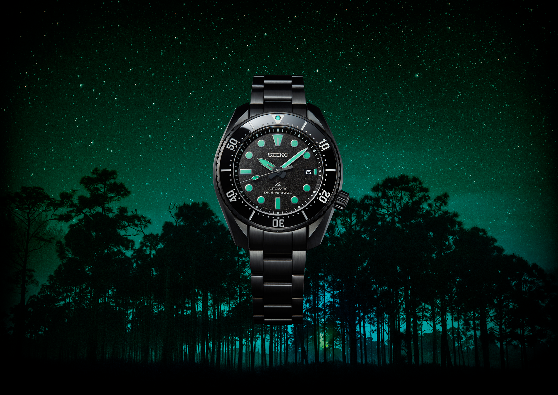 A new addition to the Prospex ‘Black Series’ Limited Edition collection, the ‘Night Vision’ Sumo Diver’s watch offers a unique underwater night diving experience through a night scope. Featuring a grey dial with hands and indices coated in high strength green ‘Lumibrite Pro’, this watch ensures excellent visibility in low light conditions. The use of colored Lumibrite in green, known for its superior visibility in the dark, makes this watch stand out. The scratch-proof ceramic bezel surrounding the sapphire glass adds durability to the timepiece, maintaining the classic Prospex ‘Sumo’ style with a robust appearance.