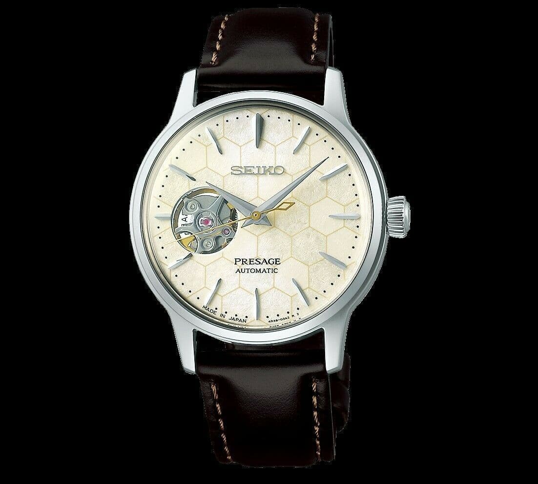The dial is characterized by the color of this original cocktail, with the honeycomb pattern inspired by the honey from bees in Ginza.