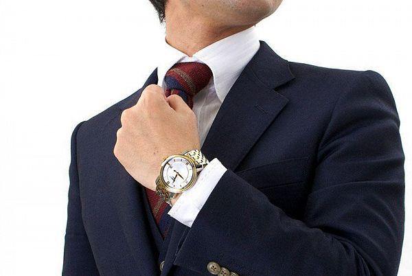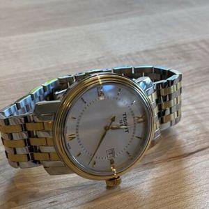 The Tissot T-Classic Bridgeport has a stainless steel case of 40mm. The crown and two rows of links of its bracelet are gold plated.