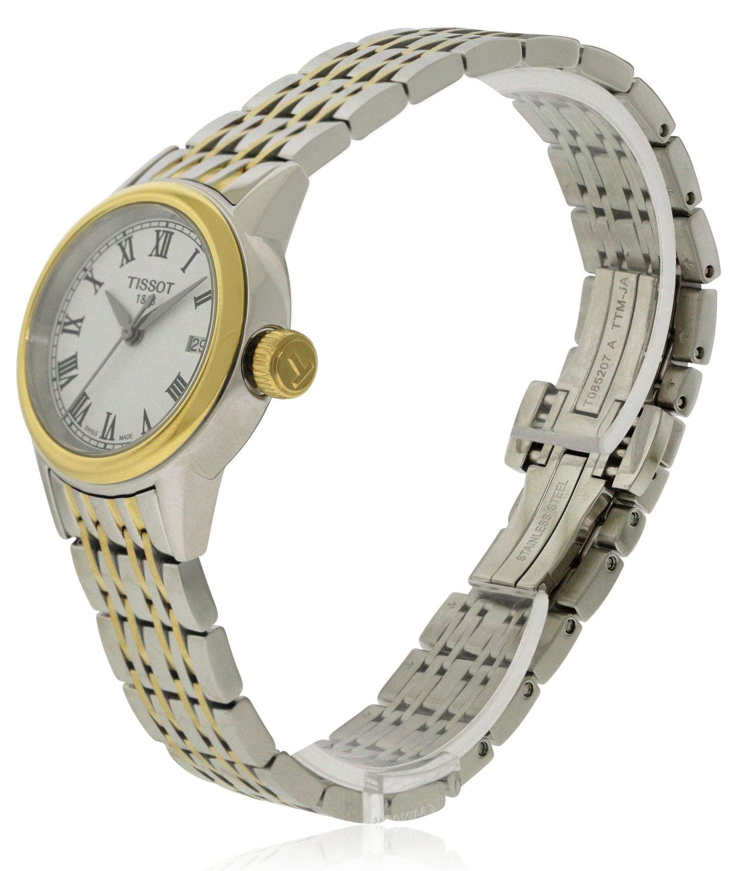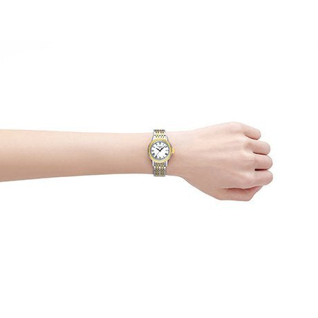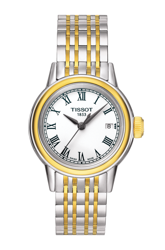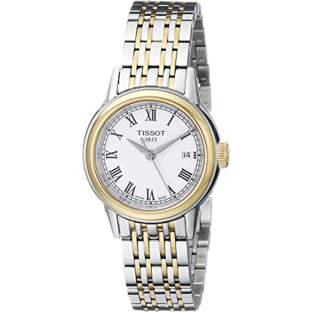 The Tissot Carson has a stainless steel case of 28.5mm. The crown and two rows of links of its bracelet are gold plated. This watch is powered by the ETA caliber 803.112 quartz movement.