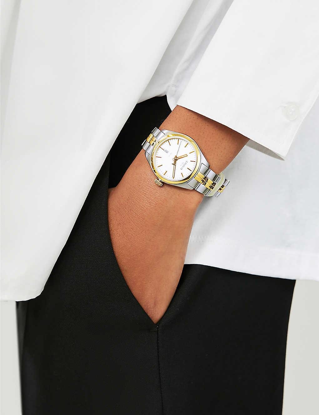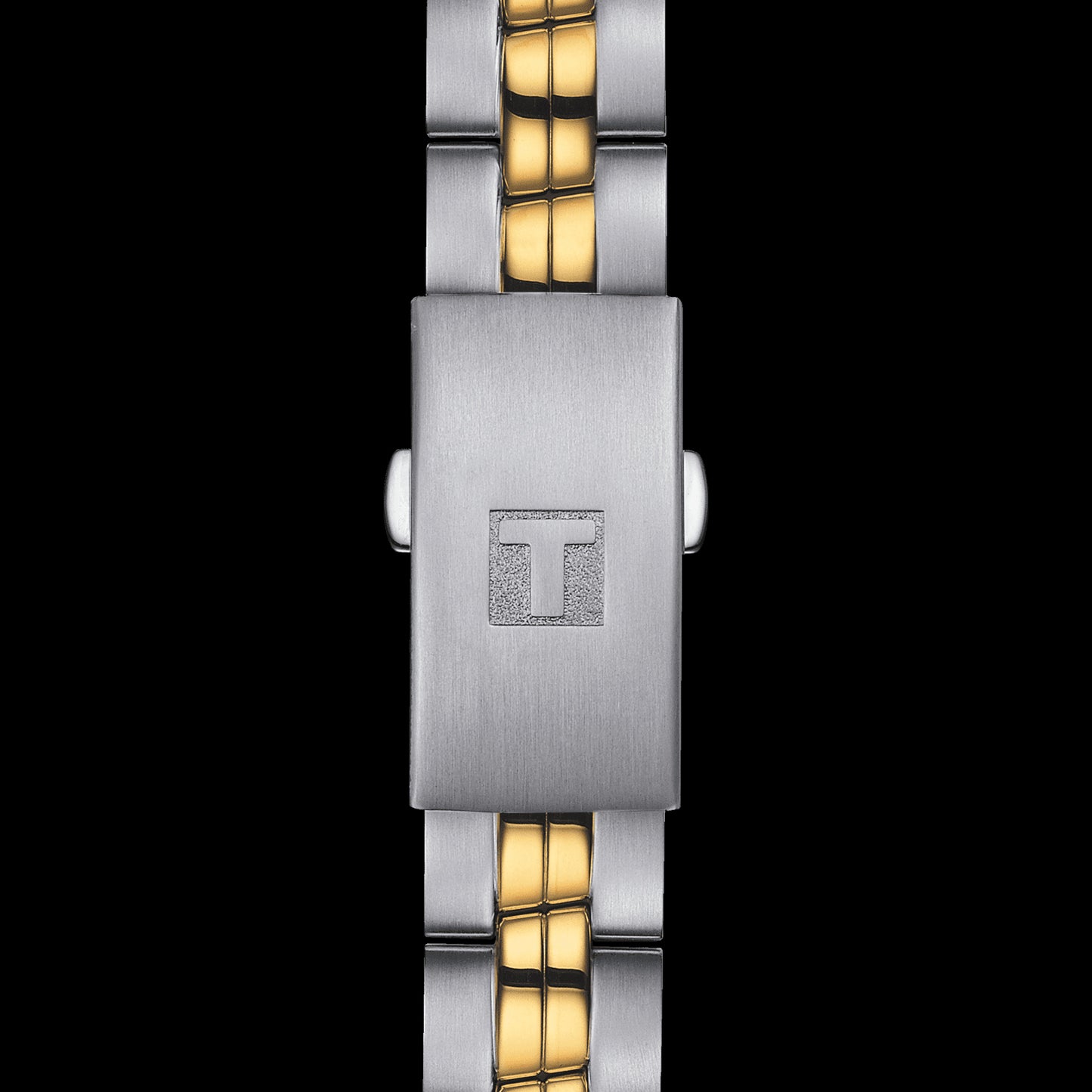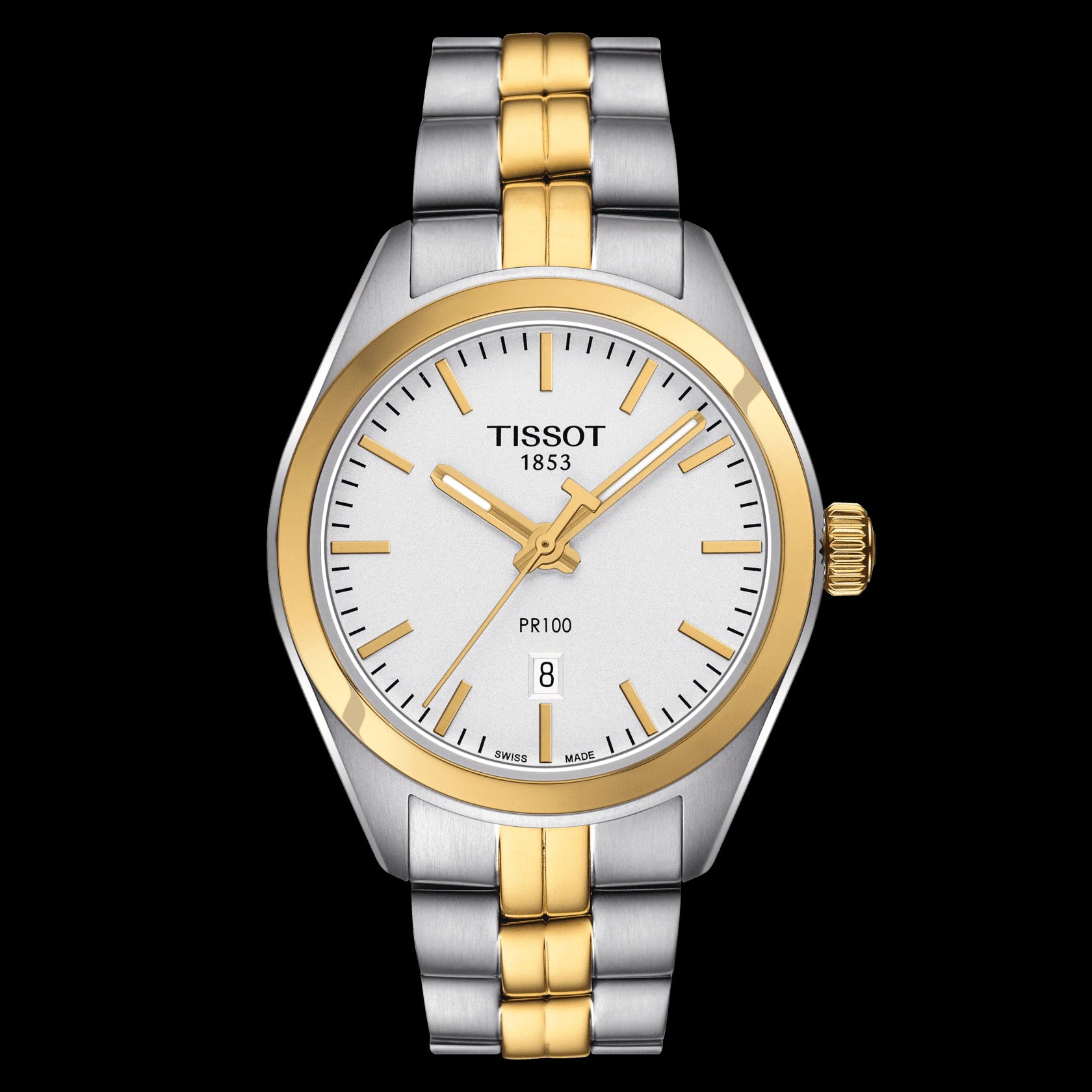 The Tissot T-Classic PR100 has a stainless steel case of 33mm. The crown and two rows of links of its bracelet are gold plated.