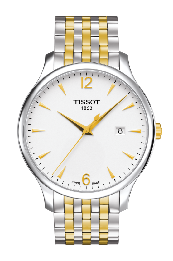 The Tissot Tradition has a stainless steel case of 42mm. The crown and two rows of links of its bracelet are gold plated. This watch is powered by the ETA caliber F06.111 quartz movement.