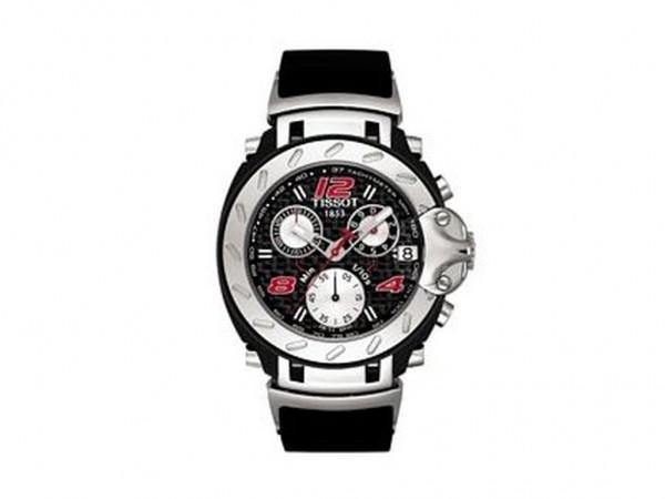 Tissot T-Race NASCAR Watch with NASCAR styled box with checkered line, NASCAR checkered flag bag, and NASCAR helmet which holds the watch. Stainless steel and black resin case with a black rubber bracelet. Fixed silver-tone bezel. Black dial with luminous hands and index hour markers. Red arabic numerals mark the 4, 8 and 12 o'clock positions. Tachymeter scale around the outer rim. Luminescent hands and markers. Date display at the 3 o'clock position. Three - 60 seconds, 30 minutes and 1/10th of a second. Quartz movement. Scratch resistant sapphire crystal. Solid case back. Case diameter: 40 mm. Case thickness: 11.85 mm. Deployment clasp. Water resistant at 100 meters (330 feet). Functions: hours, minutes, seconds, date, chronograph.